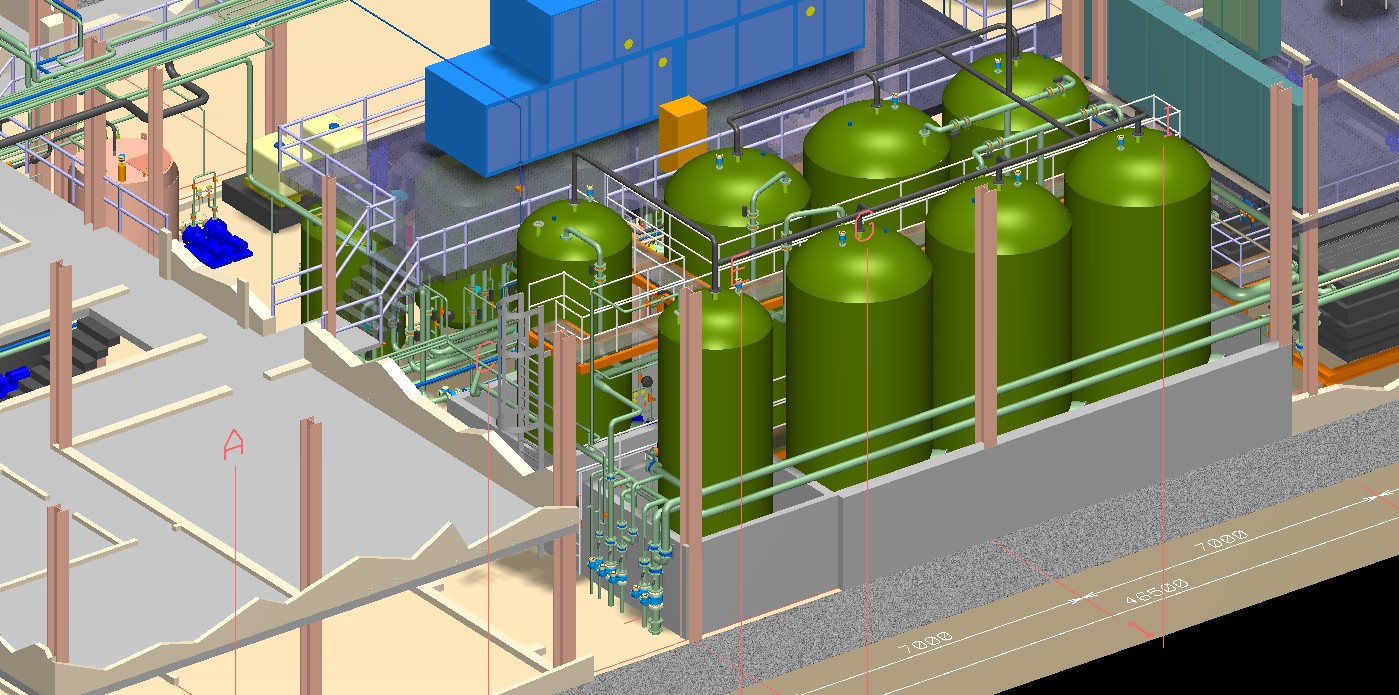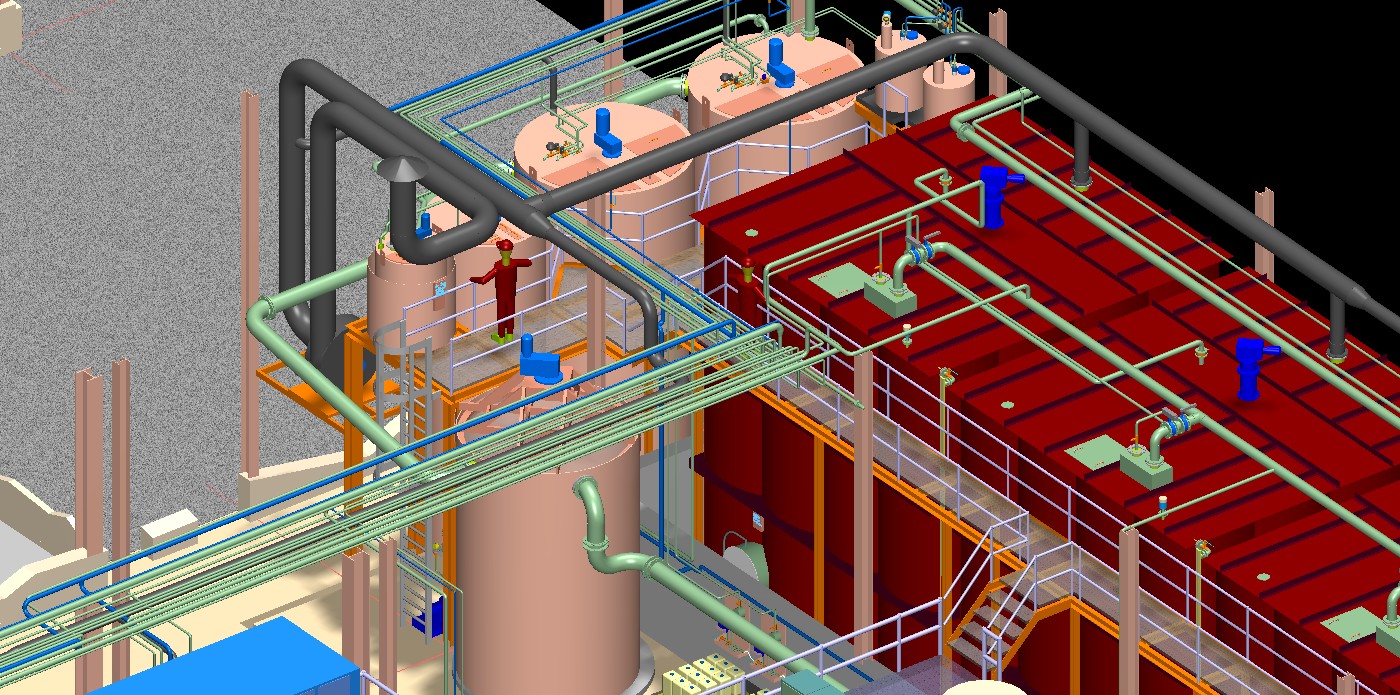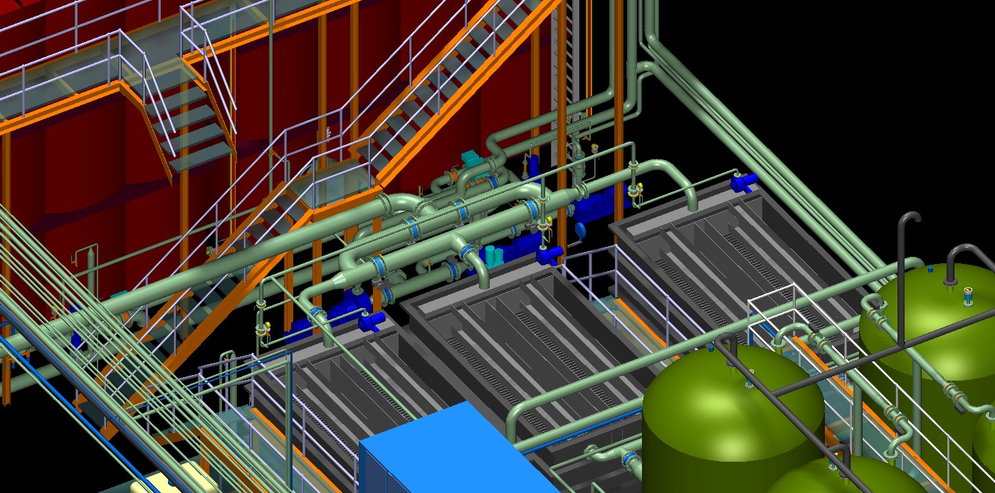 Beispiel Industrieabwasseranlage (unser Beitrag war die Vor Ort Aufnahme und "as built" Modellierung der komletten Anlagentechnik und des Gebäudes sowie die Erstellung von Bestandsplänen):