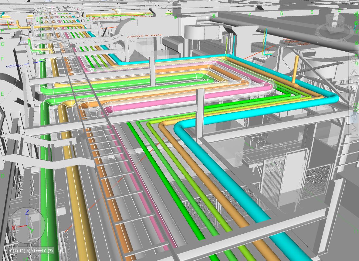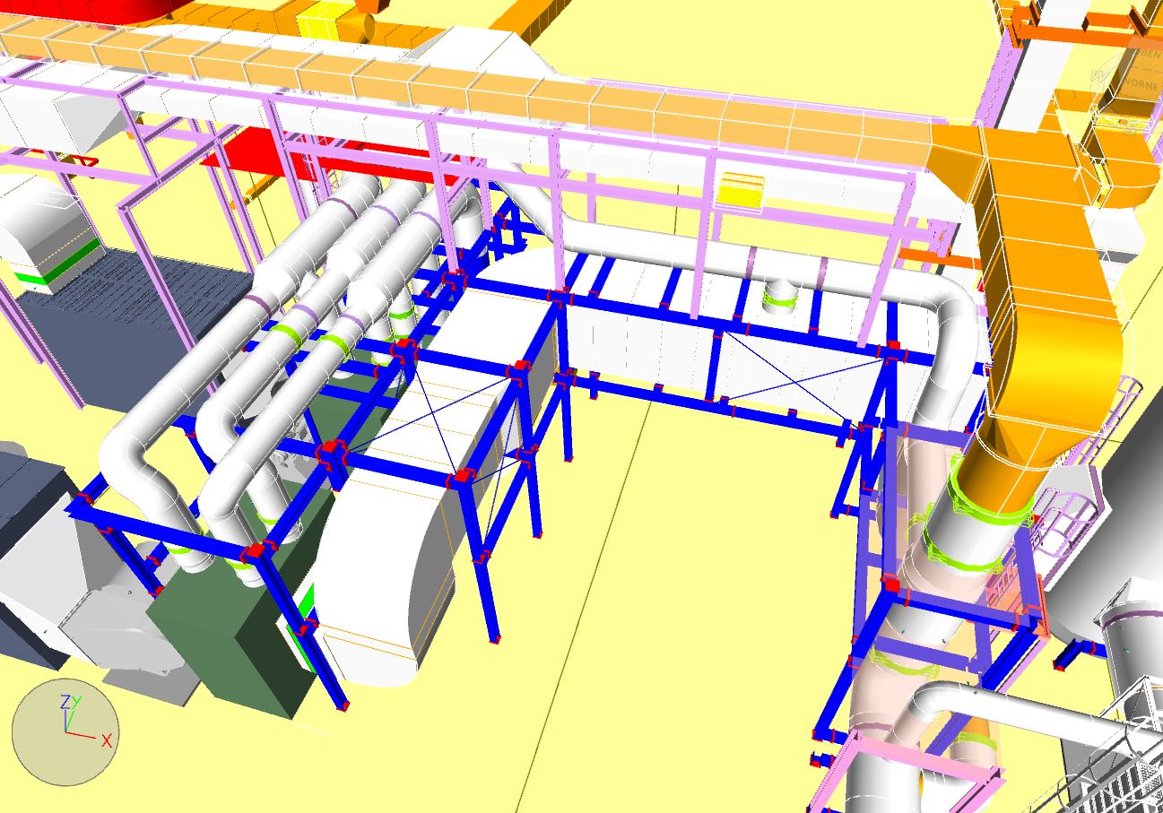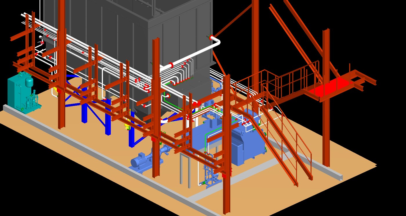 3D CAD Digitale Fabrik und LayouterstellungWir nehmen Ihren Bestand incl. des Gebäude vor Ort auf. Die Modellierung der Anlagentechnik erfolgt in der Regel mit Microstation und den TRICAD MS Modulen Fördertechnik, Stahlbau, Heizung, Sanitär, Lüftung, Elektro.Neuanlagen planen und konstruieren wir lagegerecht und entsprechend Ihrer CAD Richtlinien. Die Detailtiefe geben Sie vor. Wir überprüfen unsere Planung mit NavisWorks auf Kollisionen. Sie erhalten von uns Layouts, Verfahrensschemata, Aggregateaufstellpläne, Verrohrungspläne, Belastungspläne, Anschlußpläne Elektrik, Fundamentpläne, Sicherheitslayouts etc. Beispiel TGA (3D Detailplanung der Verrohrung, Erstellung von Stücklisten, Montageplänen etc.)